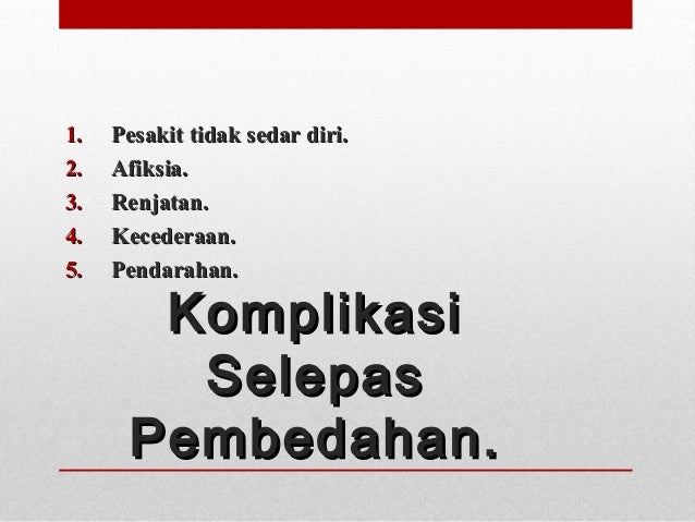 Menerangkan komplikasi-komplikasi selepas pembedahan. Pesakit tidak sedar diriPesakit tidak sedar diri.