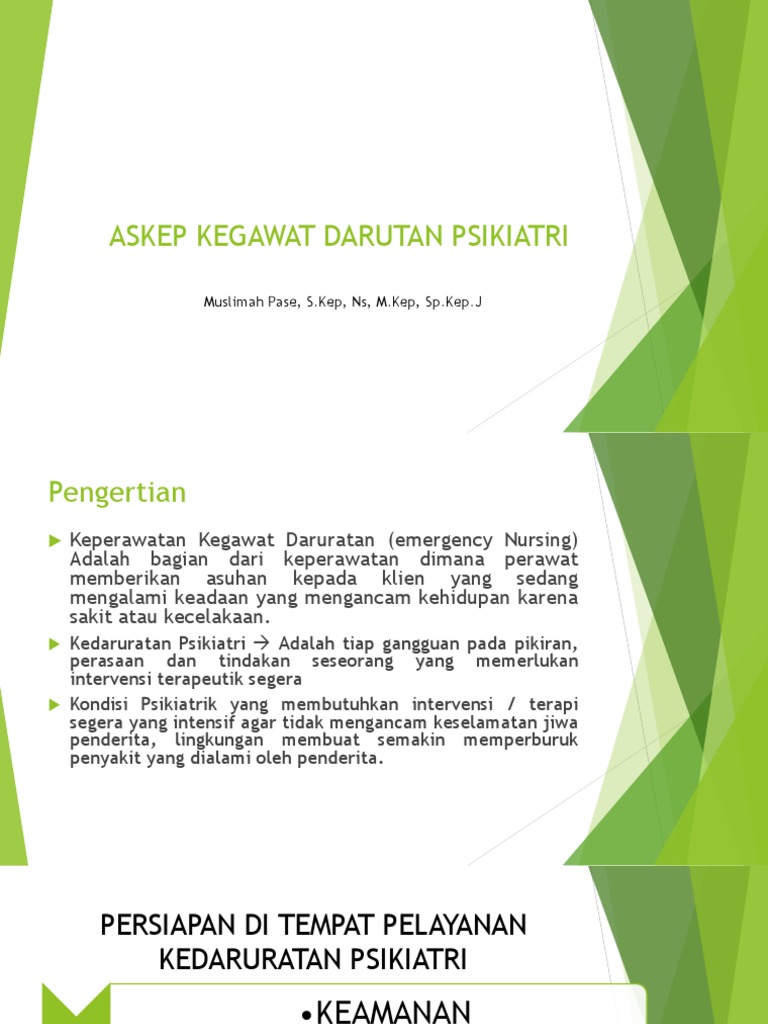 PSIKIATRI Perawat Psikiatri memberikan perawatan bagi pasien dan keluarga terhadap penyakit kejiwaan dan mental. Teknik de-escalation Part 3. Menerangkan kemajuan perkhidmatan Psikiatri di Malaysia.